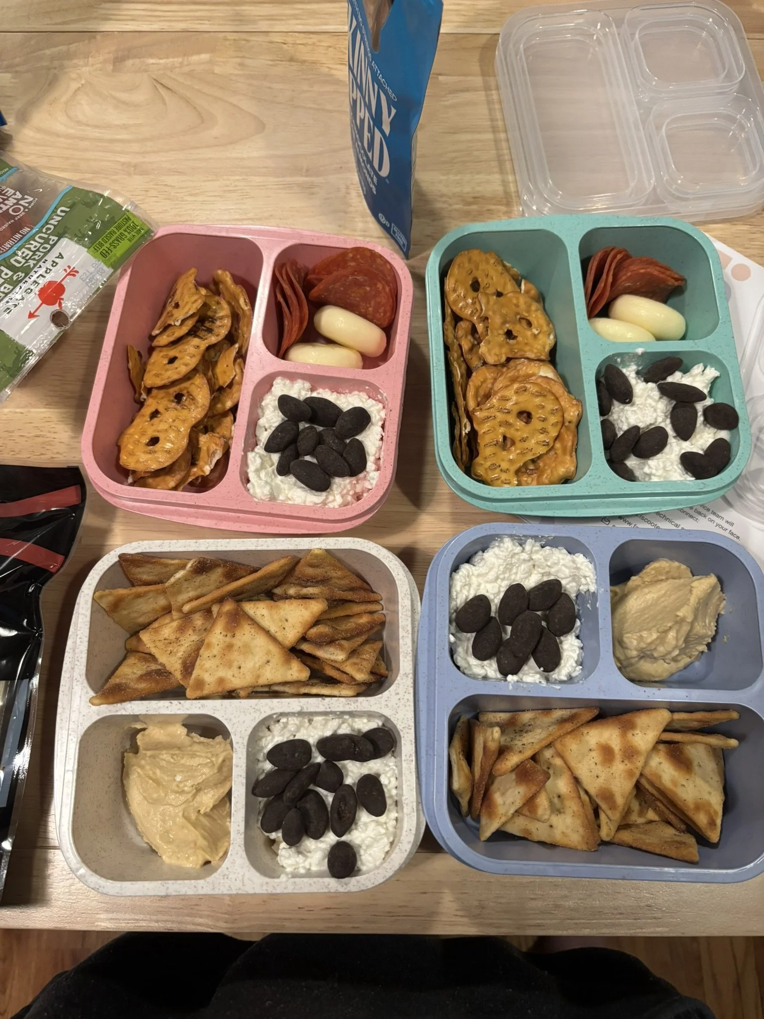 Pretzel Thins, Pepperoni, Babybel Cheese, Cottage Cheese with dark chocolate almonds