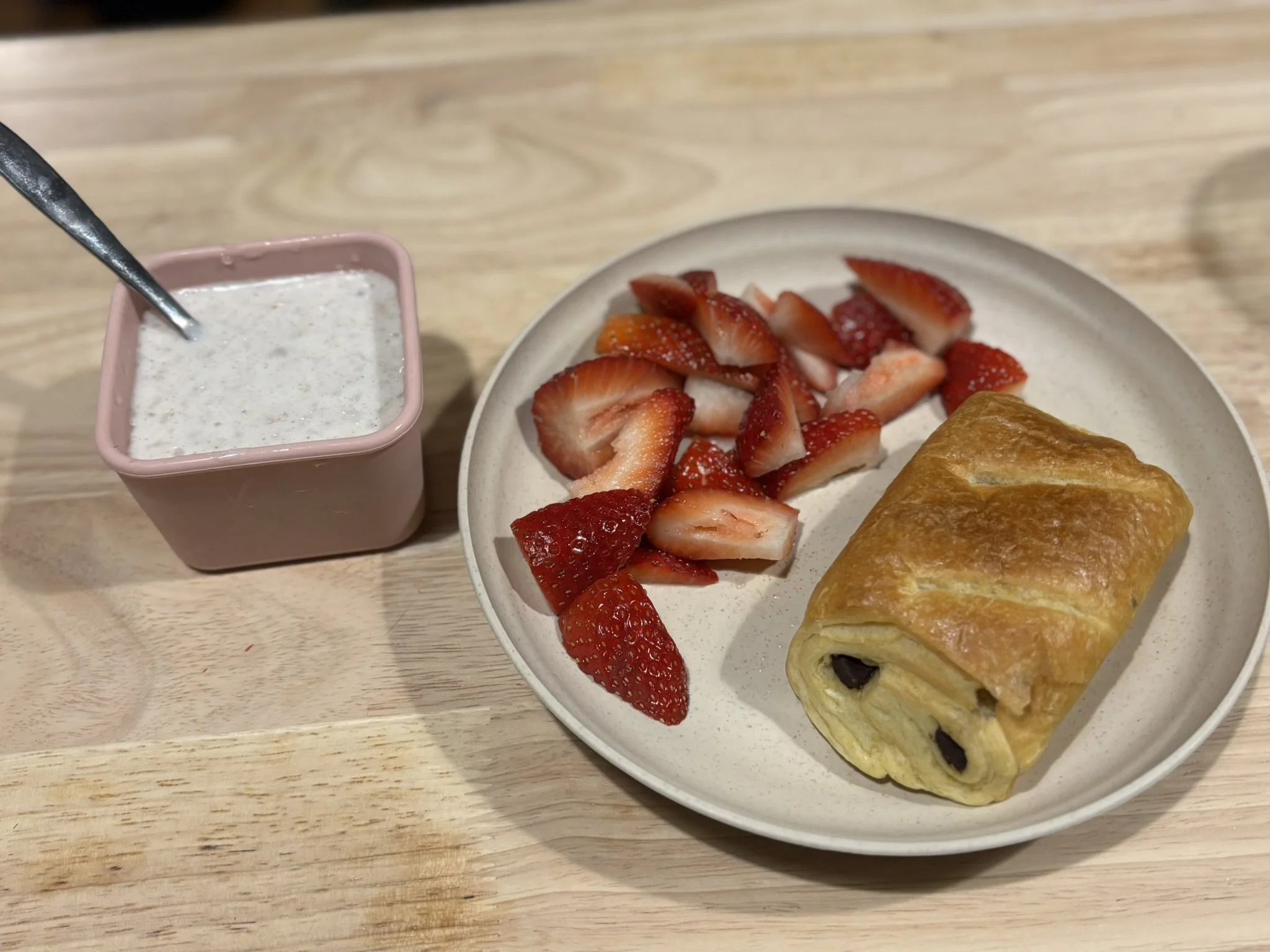 Strawberries, rice pudding, and a chocolate croissant is my go-to breakfast when I work from home during the week!