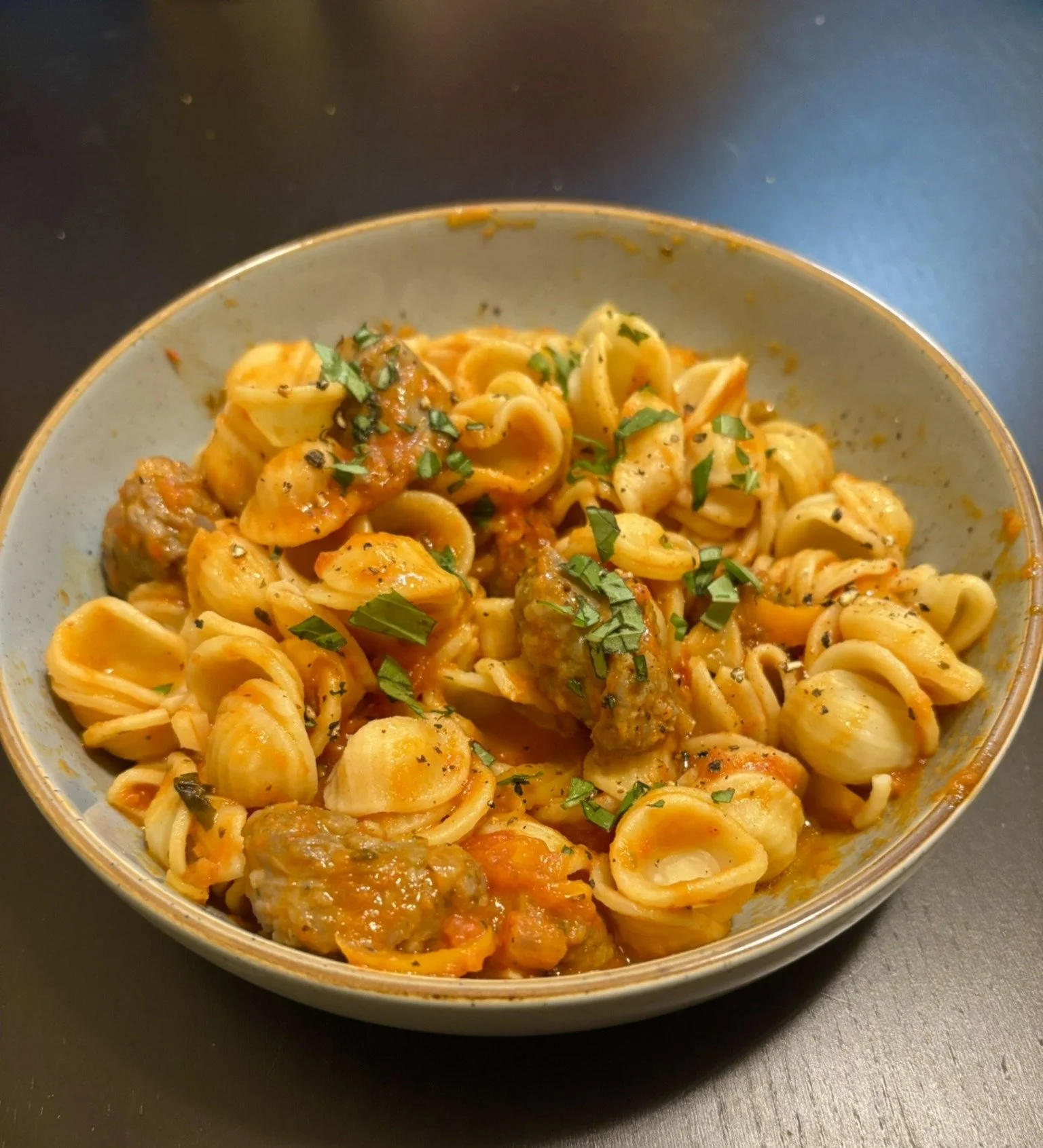 OKSO I’ve been making this recipe a lot lately for dinner and then eating the leftovers throughout the week as lunches! I don’t have a specific name for it but it’s an Italian Sausage Peppers and Onion Pasta in a yummy Arrabbiata Vodka sauce! :)
